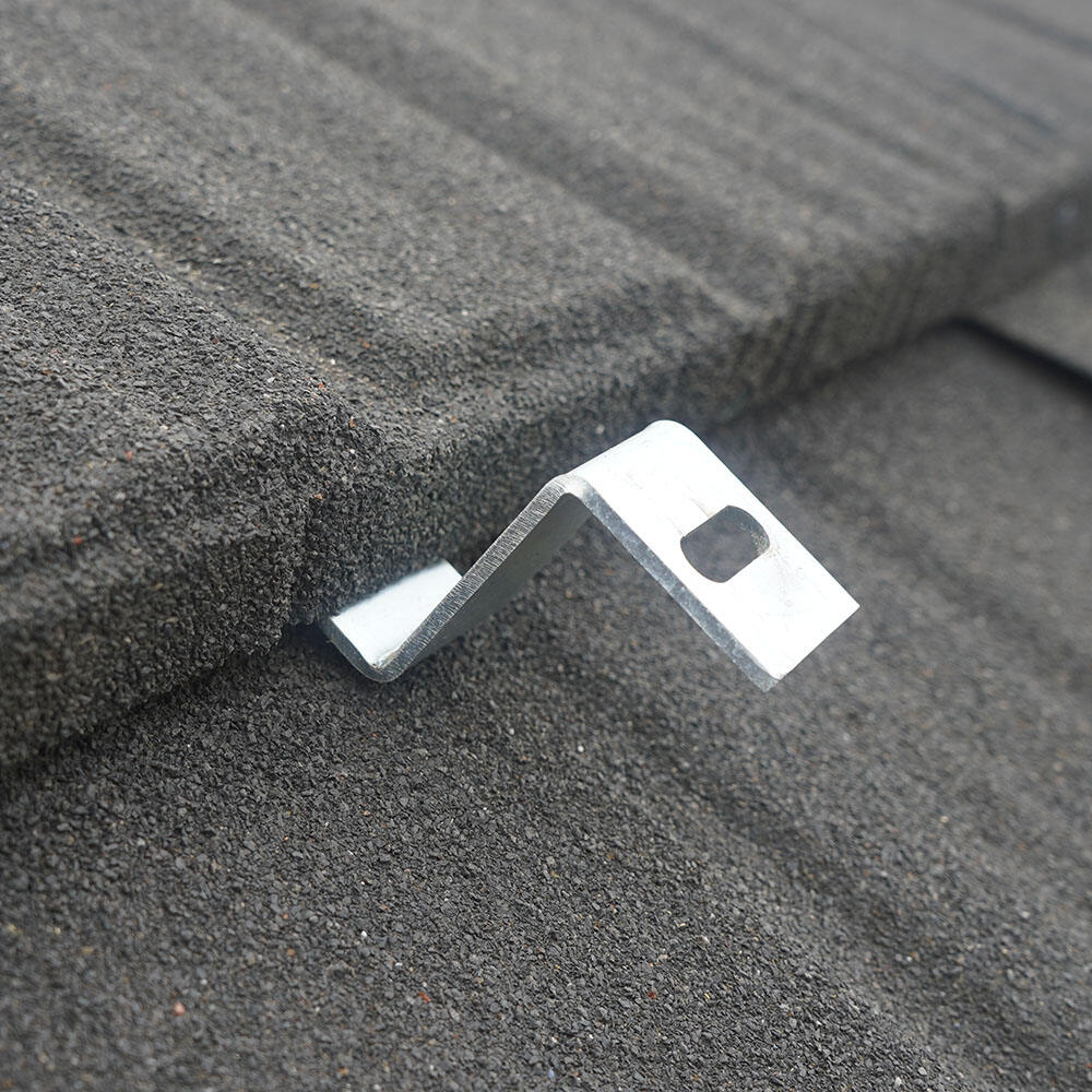 Our newly introduced TE-A2-CL1 connection clip offers a perfect solar installation solution for your stone-coated metal tile roof. The installation process is simple and effortless: just gently lift the tile, secure the mounting clip and bracket, and then reposition the tile. This allows for quick and secure attachment of solar panels to the roof, enabling an easy energy-efficient upgrade for your building and paving the way for a green energy lifestyle.